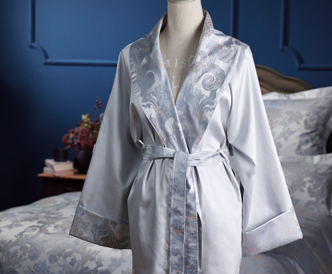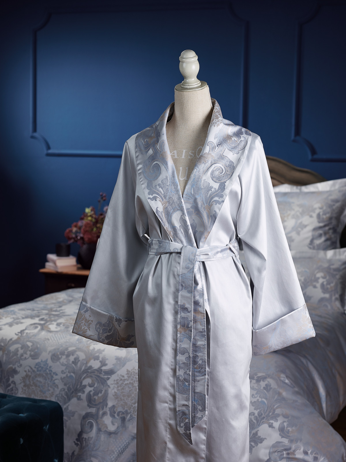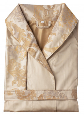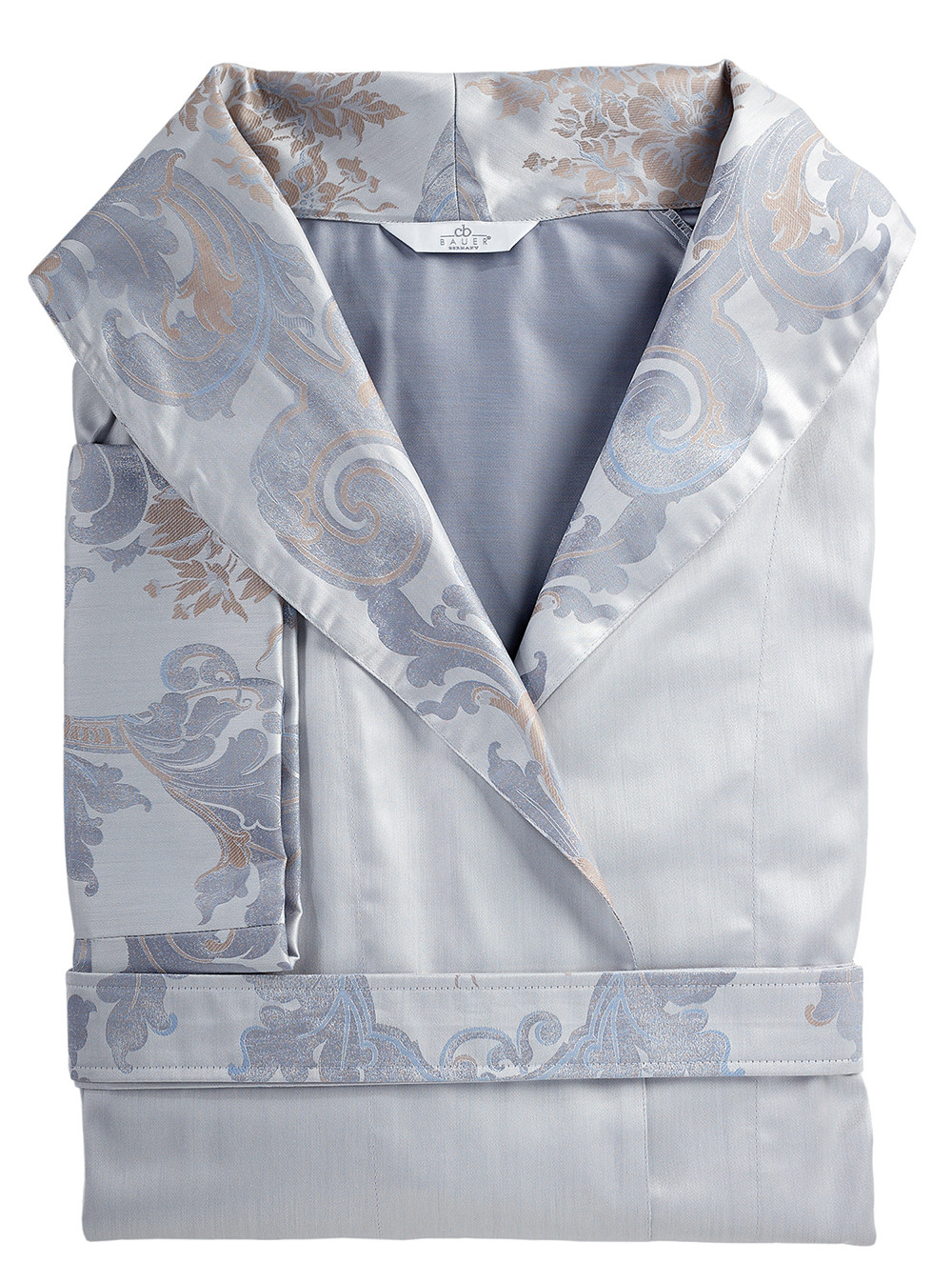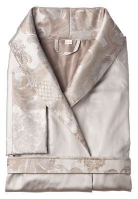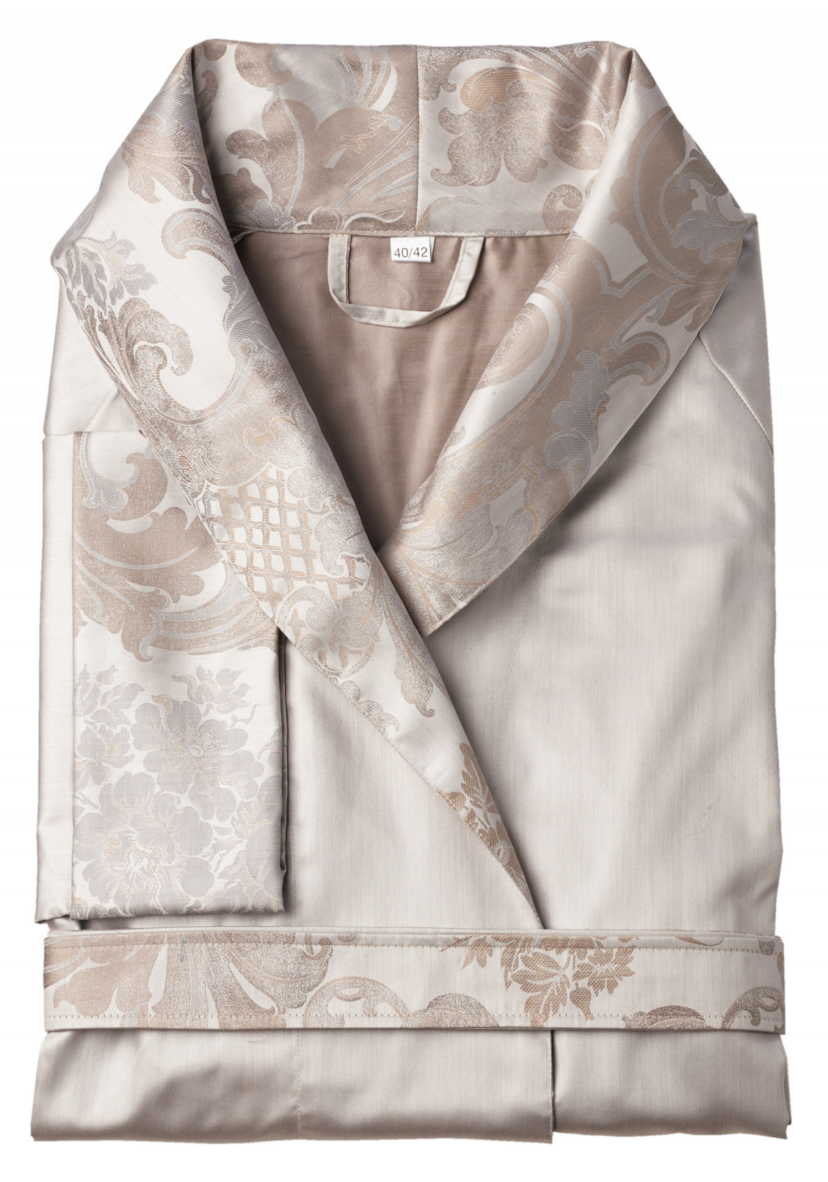 Der Schalkragenmorgenmantel in 100 % Baumwolle aus Mako-Brokat-Satin ist merzerisiert, bügelleicht und buntgewebt.