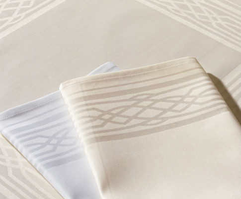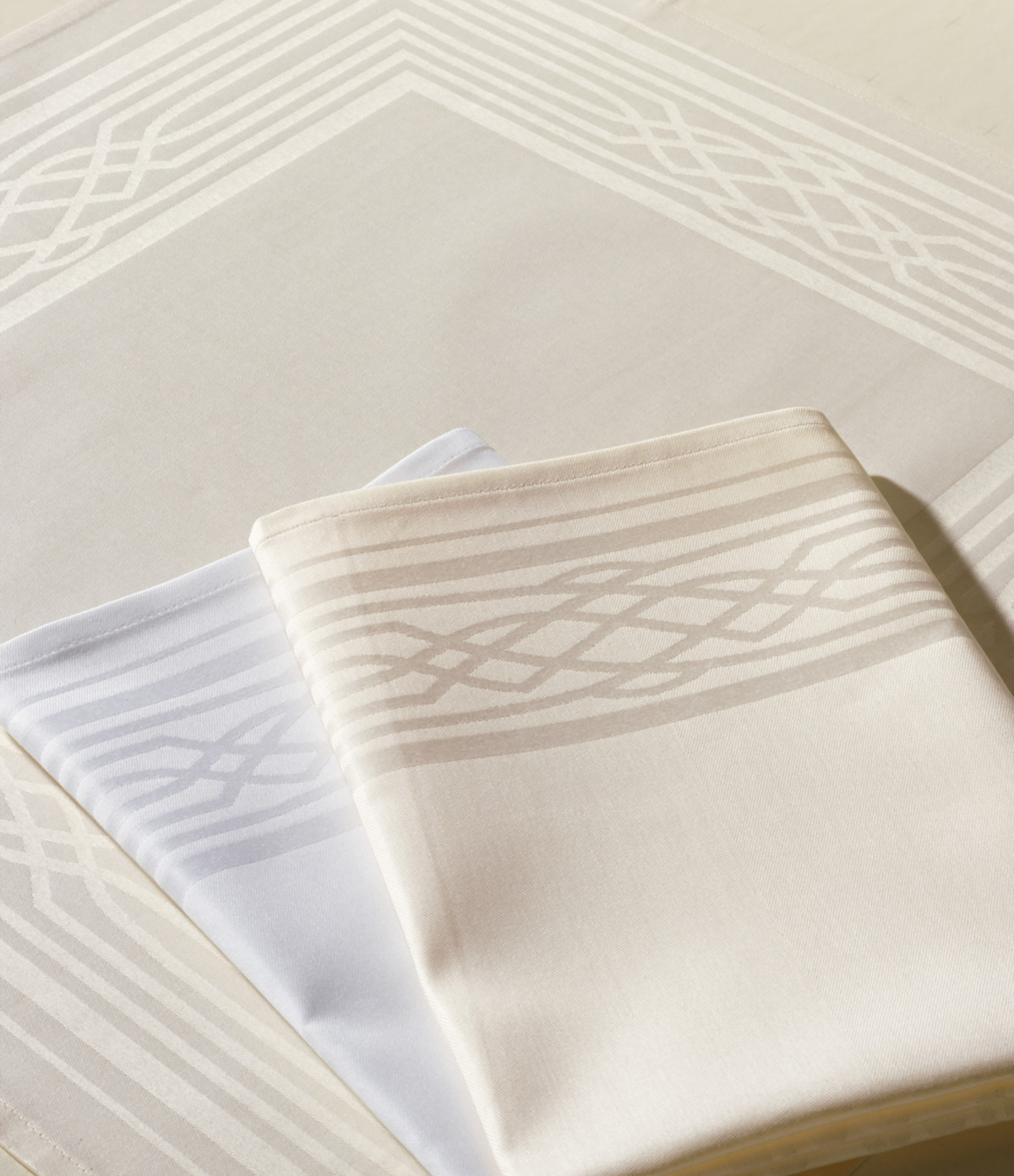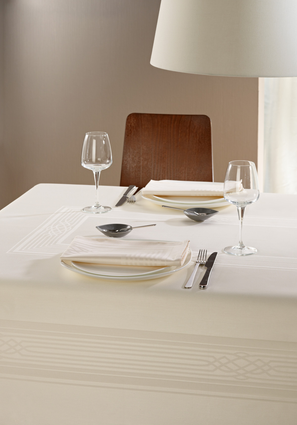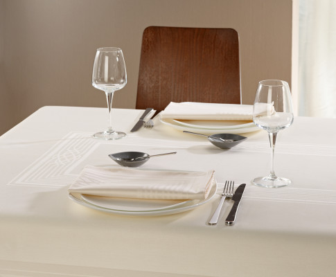 Die Servietten aus dem Tischwäsche-Damast Dessin 3405 Fuga sind bei 95°C maschinenwachbar und trocknergeeignet. Das schlichte Dessin mit geradliniger Schmuckkante ist mit 4-seitigem 1,5 cm Saum und Gehrungsecke gefertigt. Eine Serviettenpackung enthält 2 Servietten der Größe 50/50 cm.