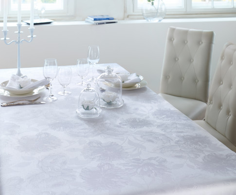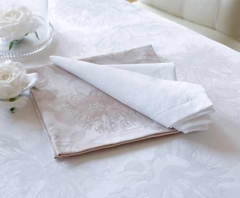 Die Servietten im Tischwäsche-Damast Dessin 3458 Diana mit großen Rosen und Pfingstrosen ist bei 95°C maschinenwaschbar und trocknergeeignet. Das Allover-Dessin ist mit 4-seitigem 3cm Ziersaum und Gehrungsecke gefertigt. Eine Serviettenpackung enthält 2 Servietten der Größe 50/50 cm.