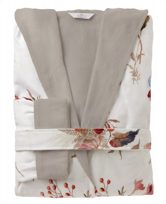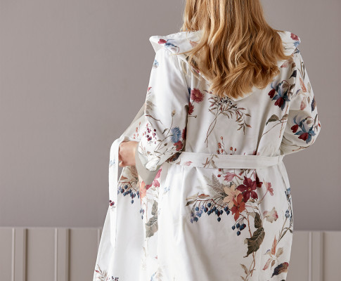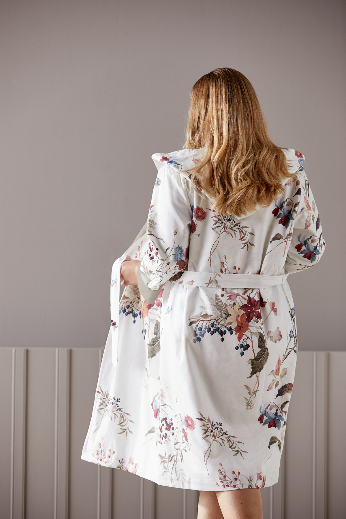 Der Damenmorgenmantel aus dem romantisch-floralen Dessin 6211 Jane mit herbstlichen Blumensträußen auf weißem Grund, Kapuze, Taschen und Frottierfutter ist bei 40°C maschinenwaschbar und trocknergeeignet.