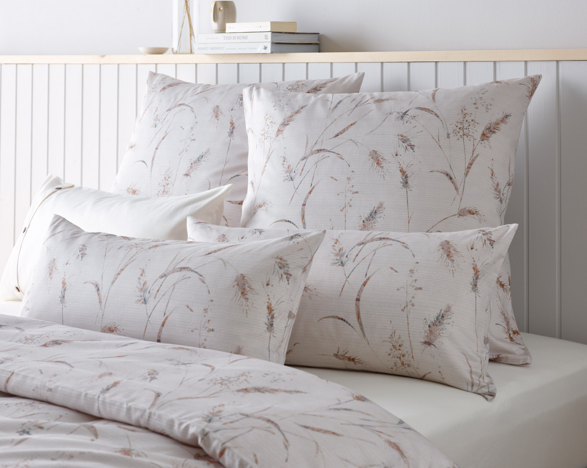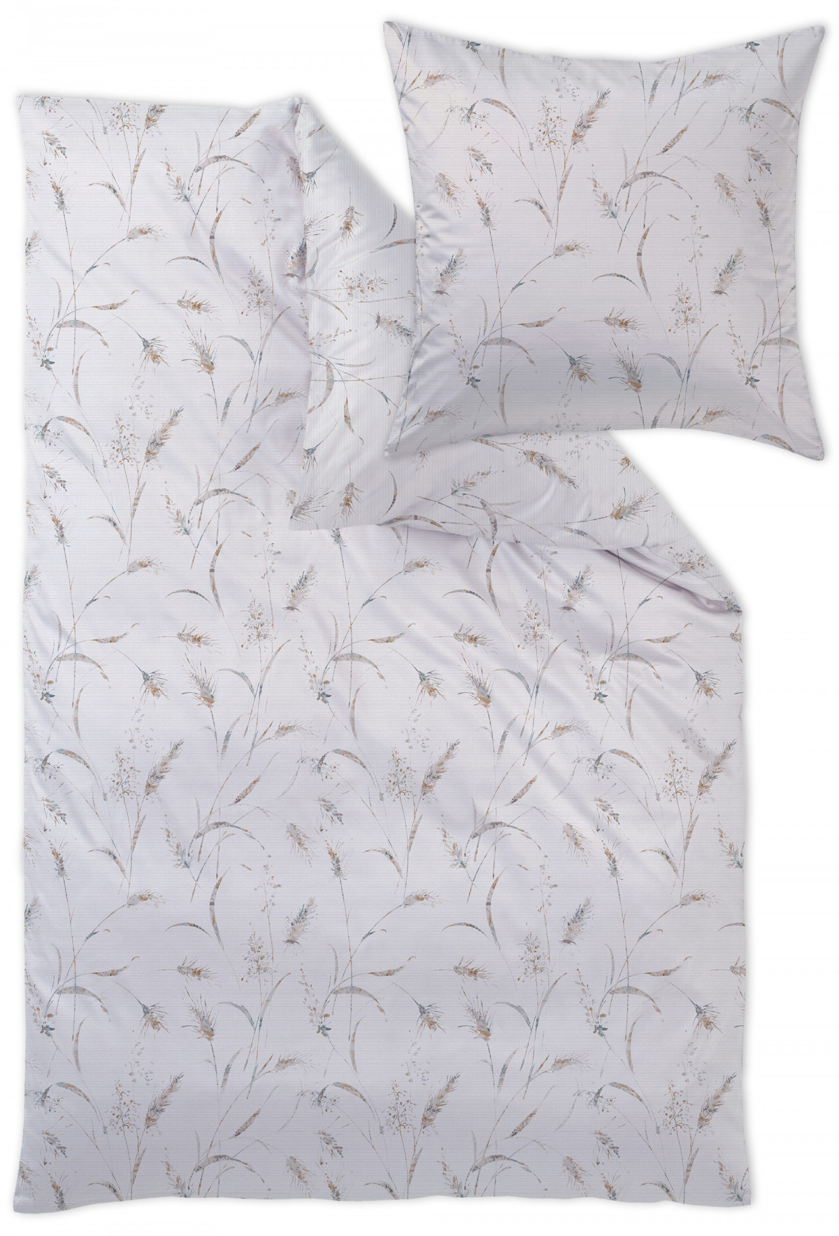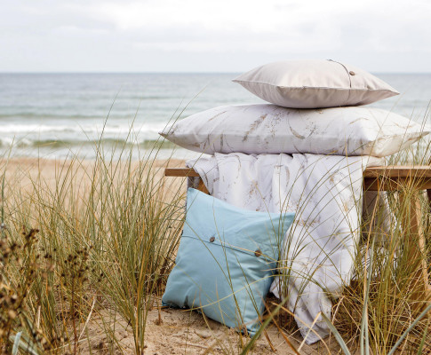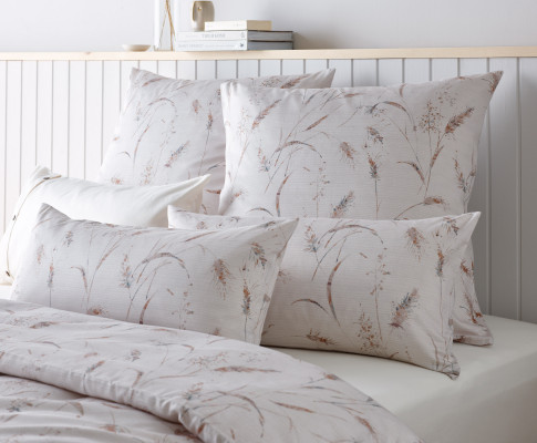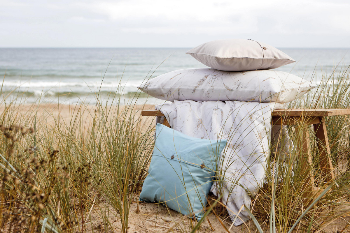 Das Wechselspiel aus filigran getuschten Gräsern, Halmen und Sträuchern, die mit harmonischen Aquarellfarben unterlegt sind, entfaltet sich auf der Mako-Satin Bettwäsche HARMONY in der Farbstellung „seaside“ mit einzigartiger Raffinesse.