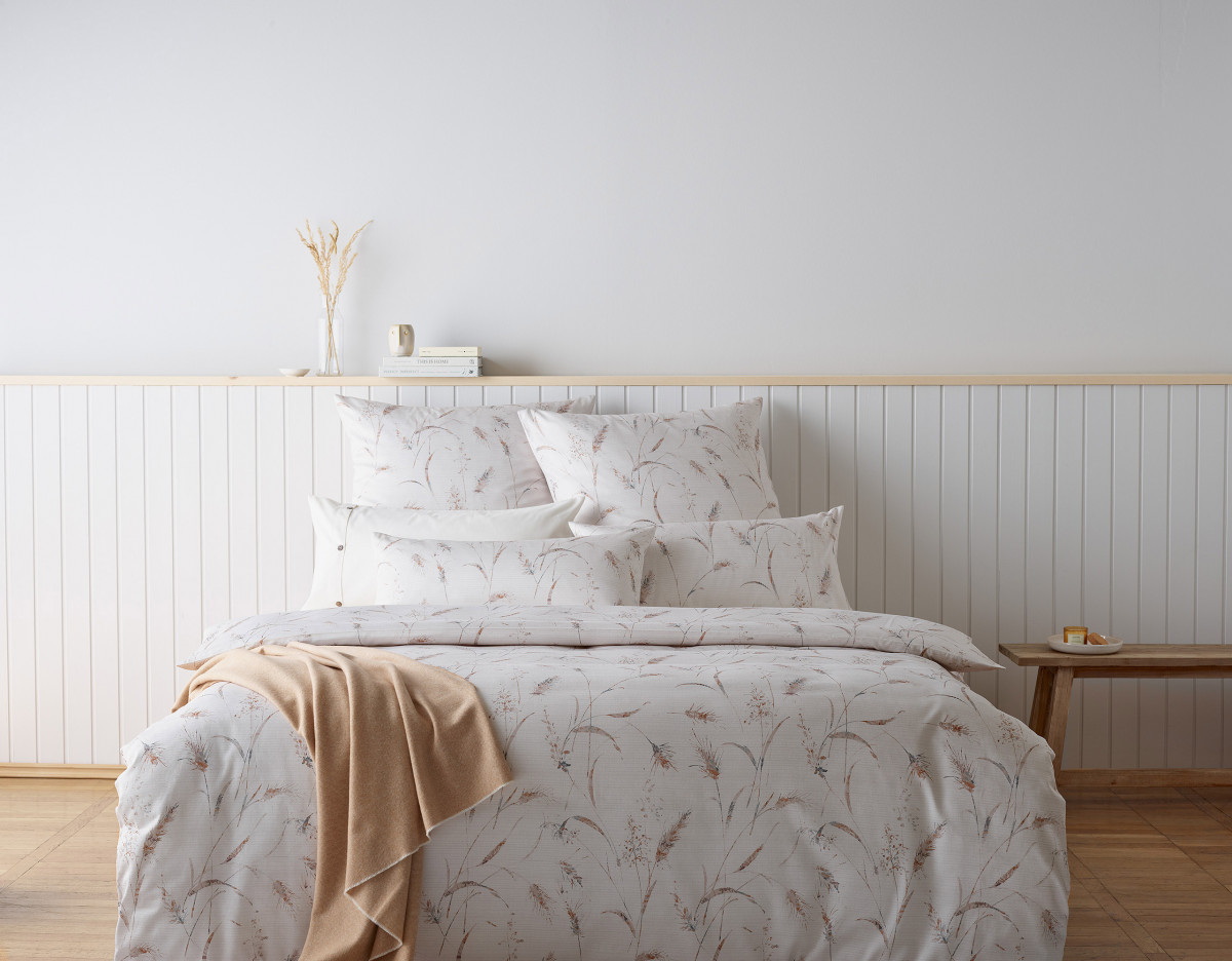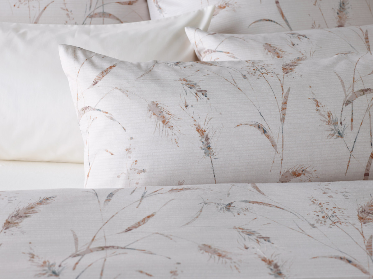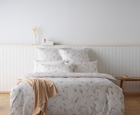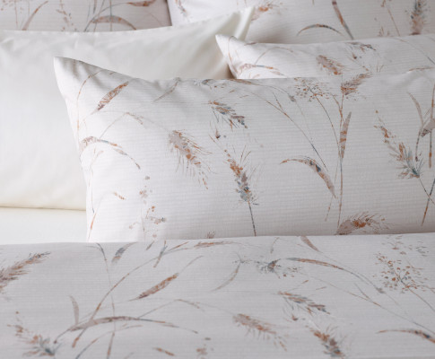 Das Wechselspiel aus filigran getuschten Gräsern, Halmen und Sträuchern, die mit harmonischen Aquarellfarben unterlegt sind, entfaltet sich auf der Mako-Satin Bettwäsche HARMONY in der Farbstellung „seaside“ mit einzigartiger Raffinesse.