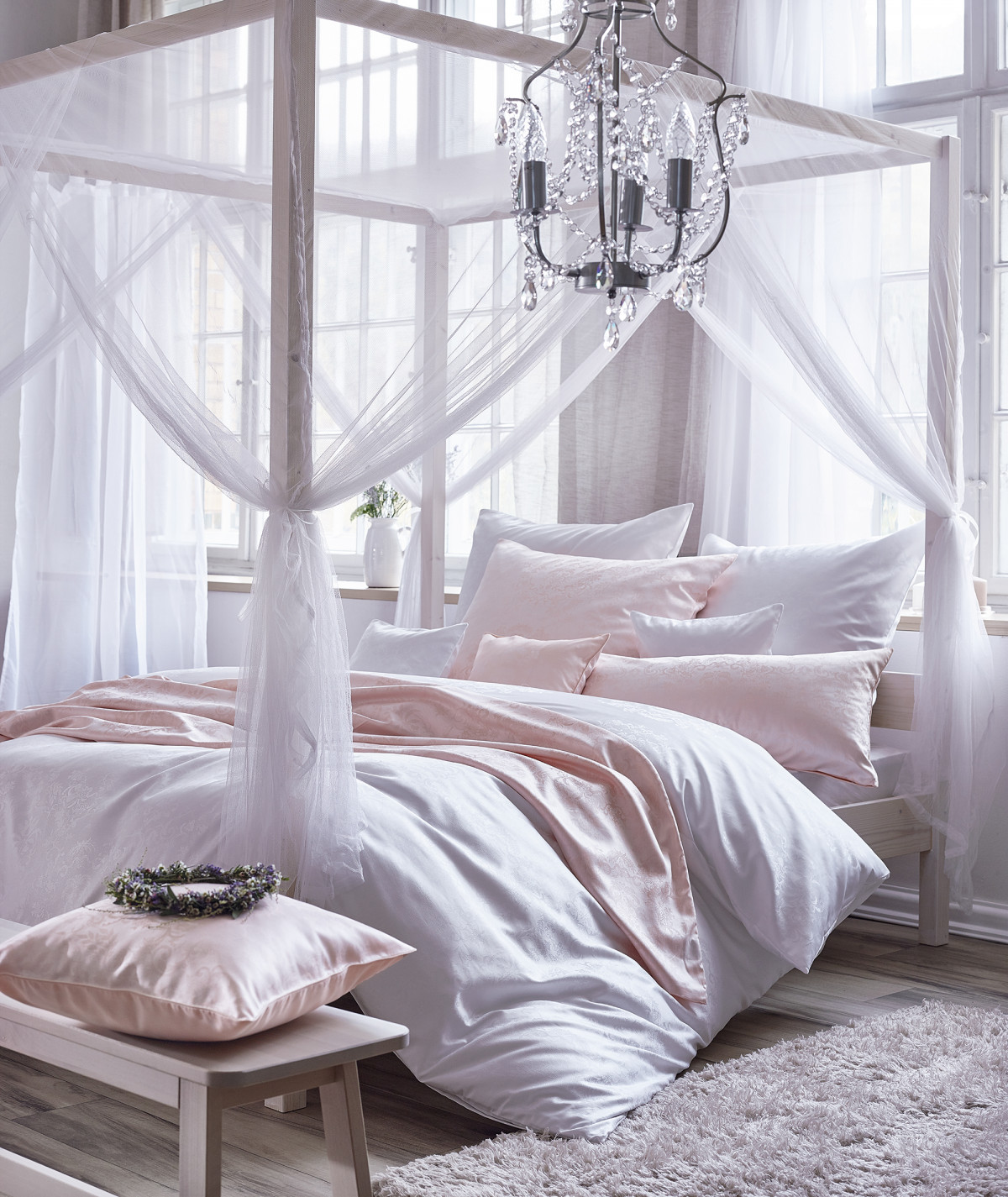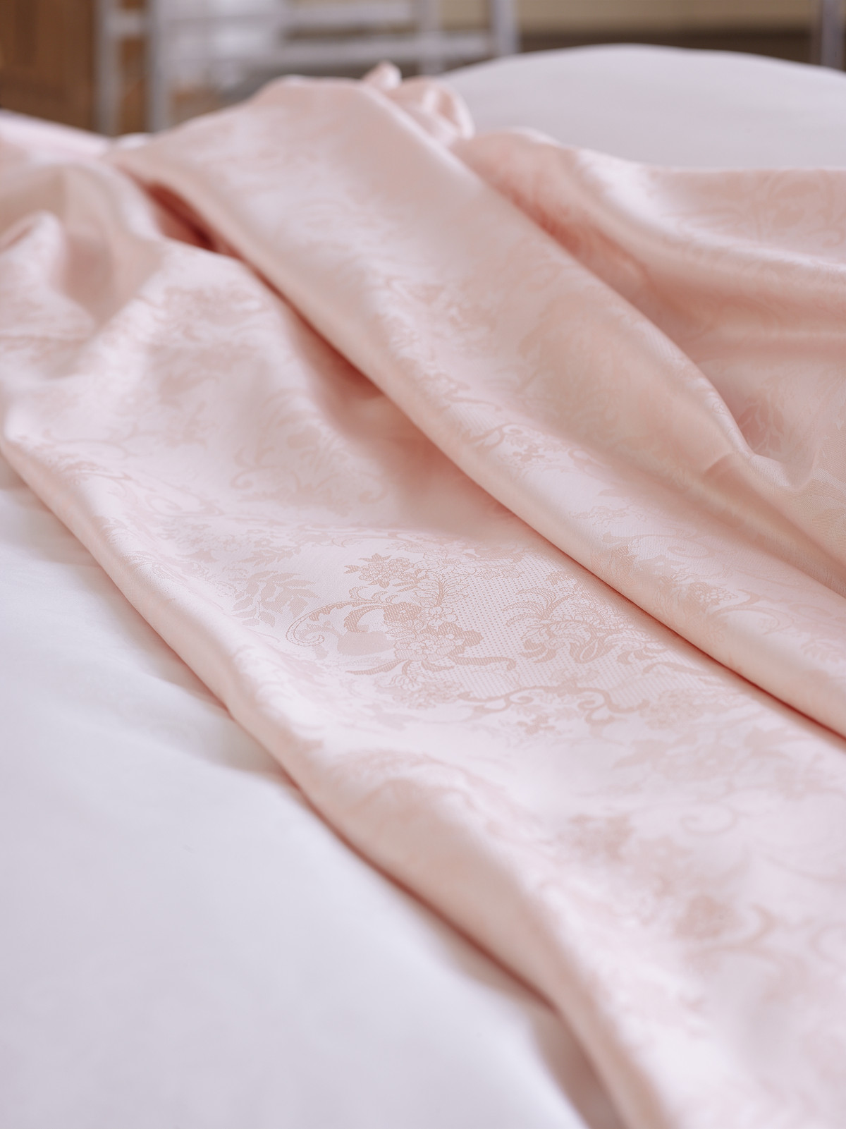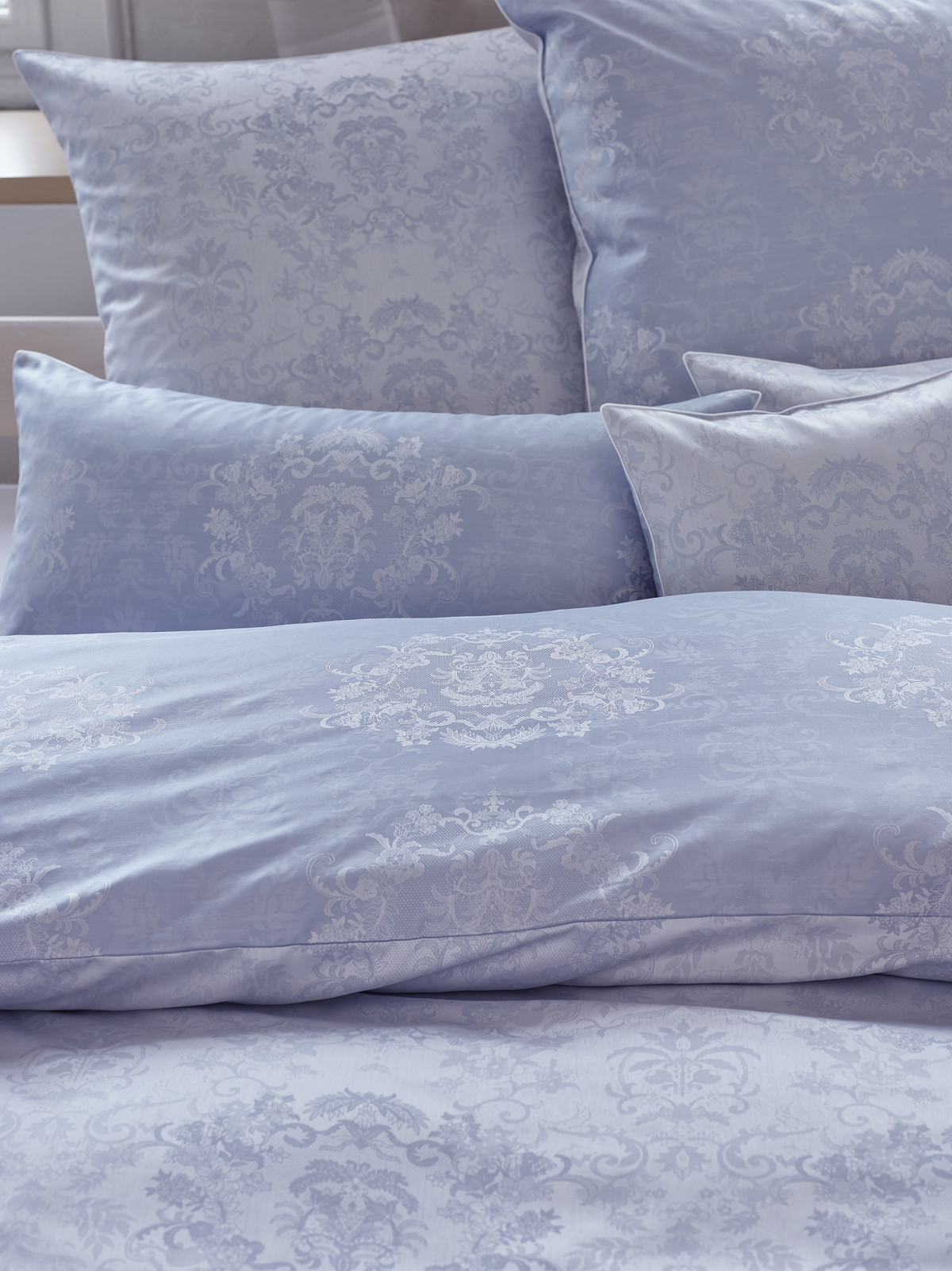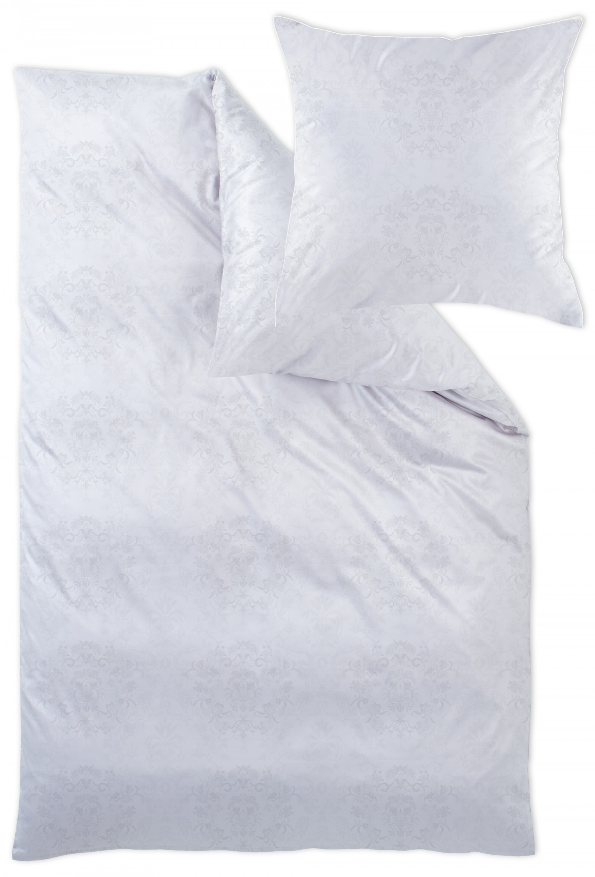 Das Dessin 9000 Finja aus 100 % Baumwolle in hochwertigem Mako-Brokat-Damast ist buntgewebt/weiß, merzerisiert, bügelleicht, 60°C maschinenwaschbar und trocknergeeignet.