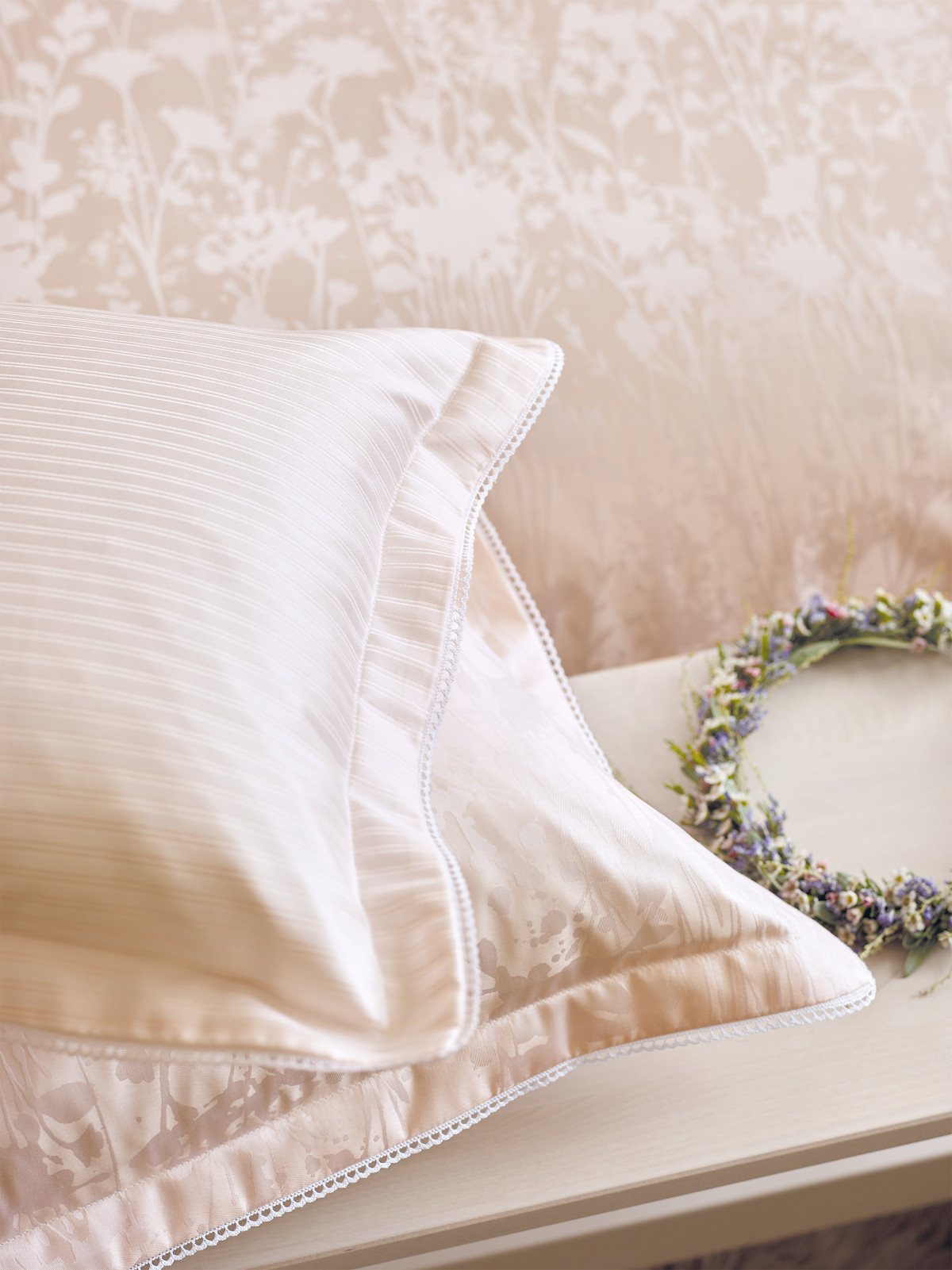 Die Kissen werden mit 4-seitig abgestepptem 3 cm-Stehsaum und Zierband gefertigt.