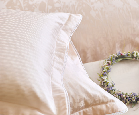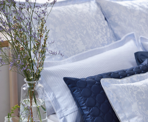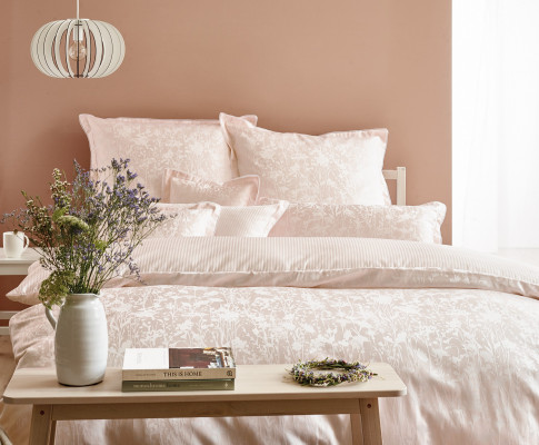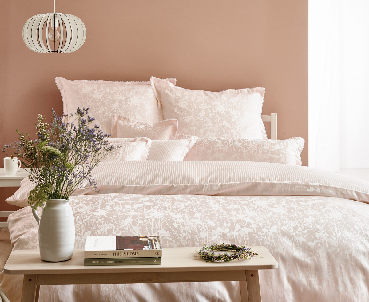 Das florale Dessin 9002 Sanna aus 100 % Baumwolle in hochwertigem Mako-Brokat-Damast ist buntgewebt, merzerisiert, bügelleicht und mit einem Qualitäts-Reißverschluss ausgestattet.