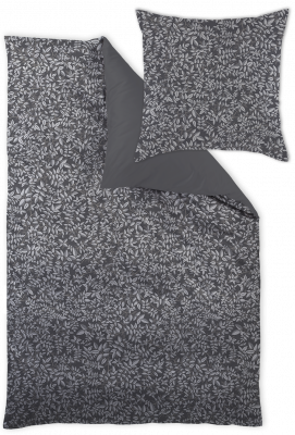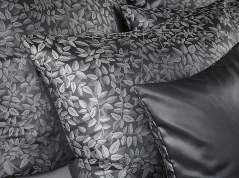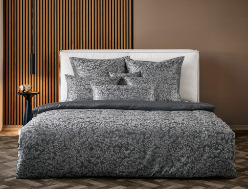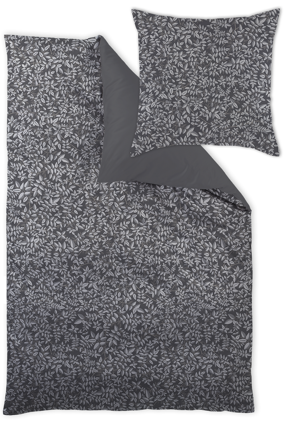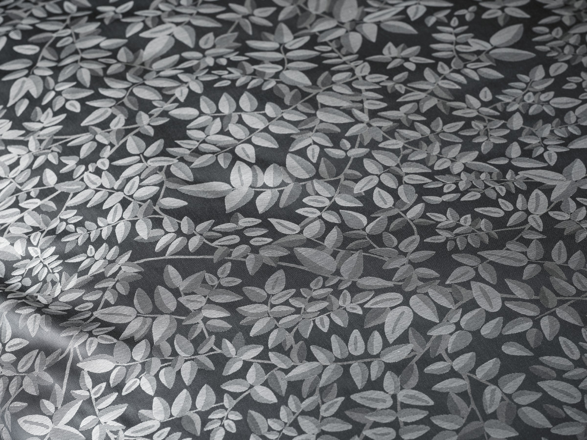 Eine moderne und stilvolle Komposition aus kolorierten Blättern vereint sich in der Mako-Brokat-Damast Bettwäsche SKAGEN zu einem weitverzweigten, endlosen Bild in der Farbstellung „schattengrau“. Besonders der dunkle, ruhende Hintergrund bringt durch den Einsatz von zwei Schussfarben die gewebte Farb- und Bindungsvielfalt in Ästen und Blättern magisch zur Geltung.