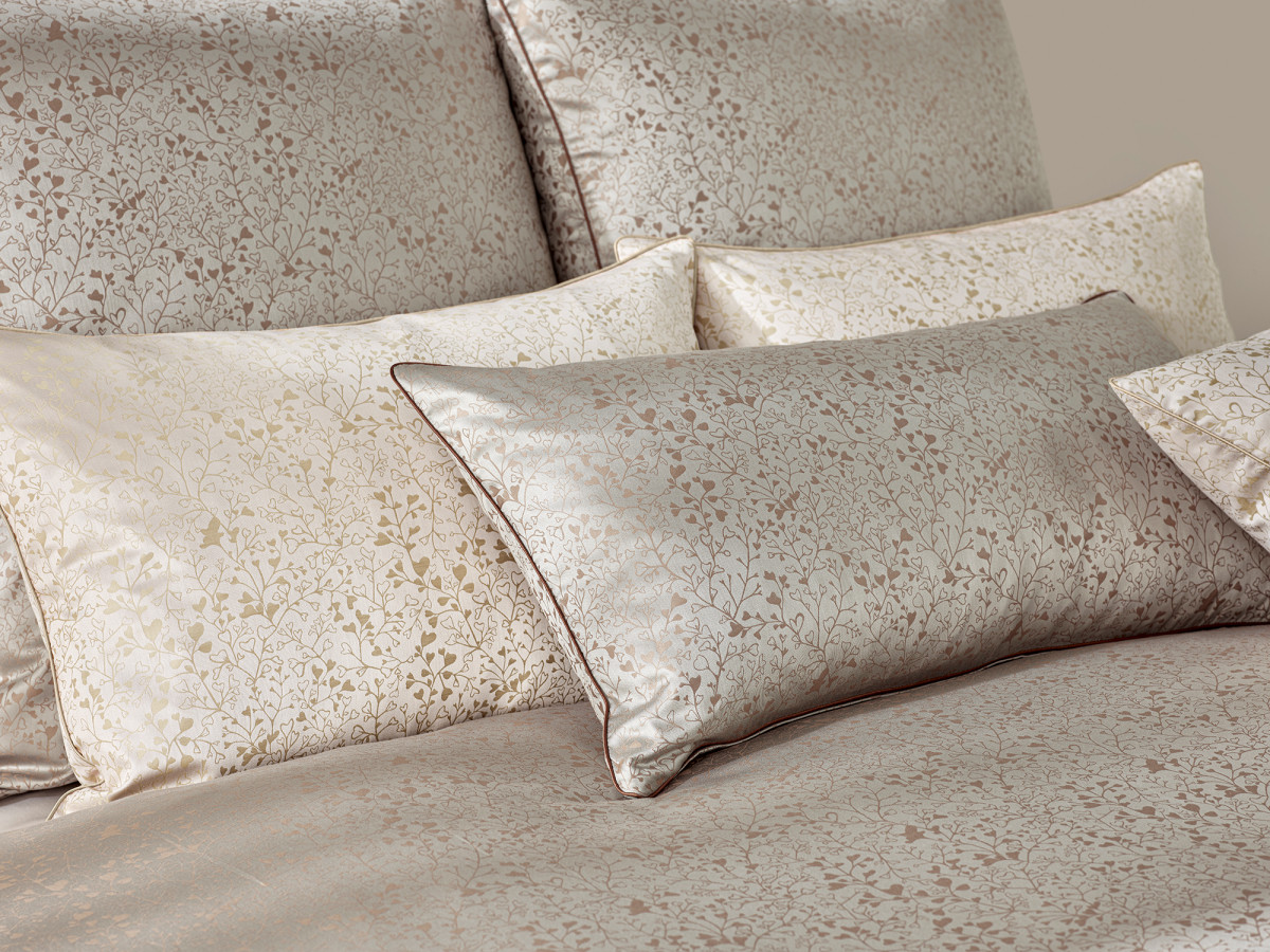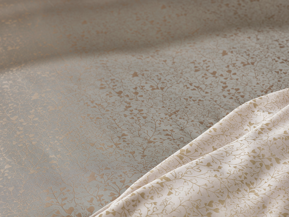 Die Mako-Brokat-Damast Bettwäsche LOVE verführt zu einem romantischen Blick in die Flora. Die abstrakte Interpretation eines Hirtentäschels verzweigt sich detailverliebt in ein kleinmustriges Allover-Motiv, das sich kontrastreich und edel glänzend in der Farbstellung „nude“ und „agave“ vom farbigen Grund abhebt.