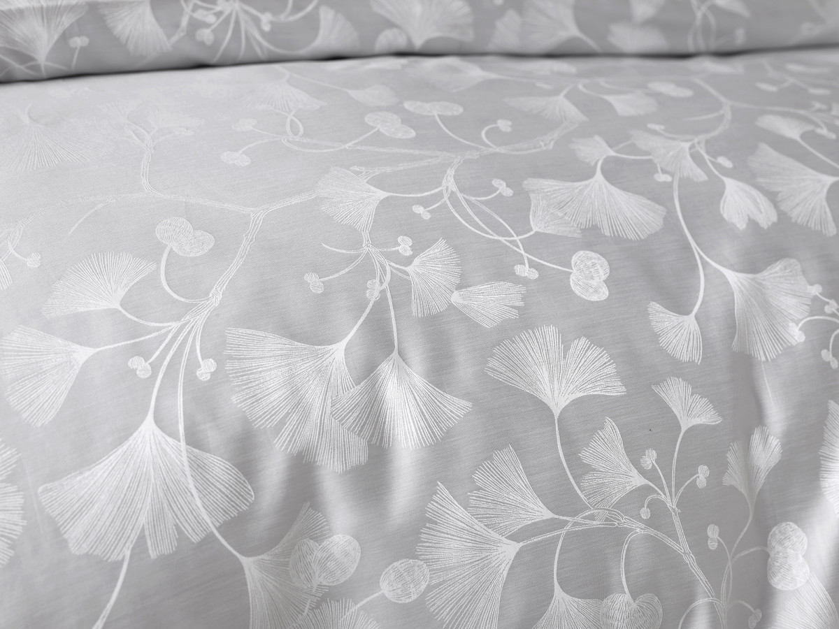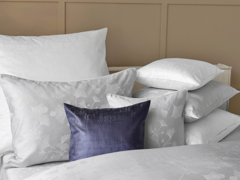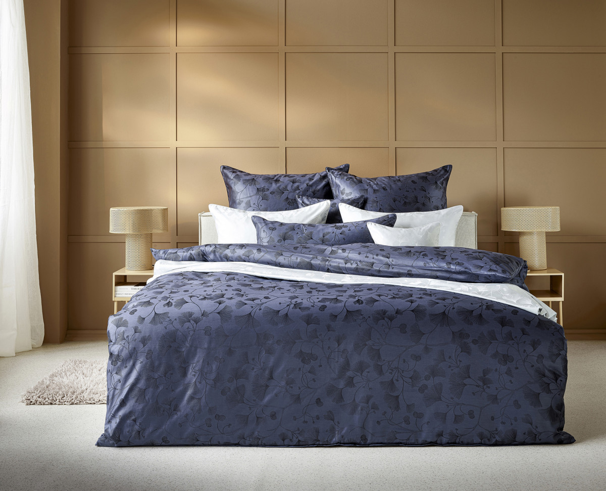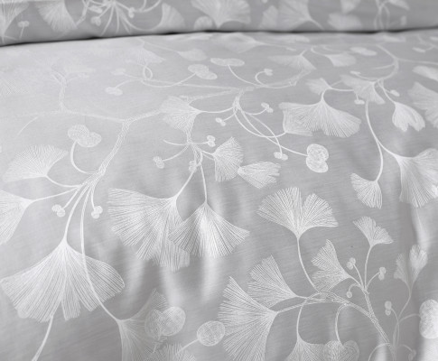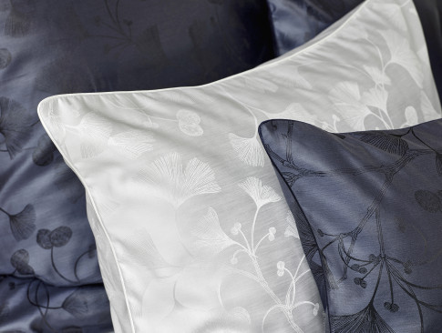 Das großzügige, organische Jacquard-Muster in der Mako-Borkat-Damast Bettwäsche AIKO bildet das Geäst eines Ginkgo-Baumes ab - ein Symbol für Stärke, Hoffnung und Frieden. Die Blätter und Samen verzweigen sich dicht aneinander und werden durch einen linearen, fast schon illustrativen Charakter in einem glänzenden Kett-Atlas, in schwarz und weiß, besonders stilvoll in Szene gesetzt. Der farbige Schuss-Atlas im Grund ordnet sich dem harmonisch unter und veredelt das Erscheinungsbild im Ganzen.