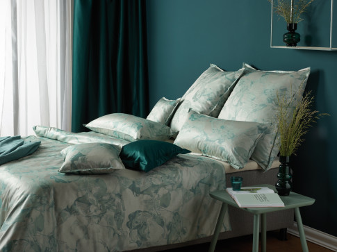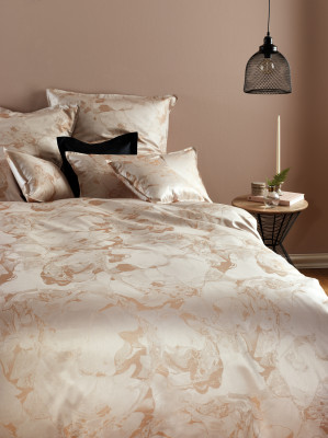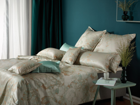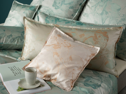 Das abstrakte Dessin Tamesis überzeugt in den Farben malachit, amber und goldengreen. Gearbeitet wurde es mit einem besonderem Kissenabschluss aus 4-seitigem Zierssaum und einer Doppelnaht.
