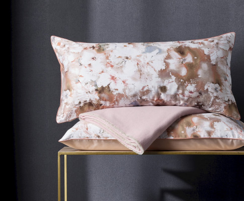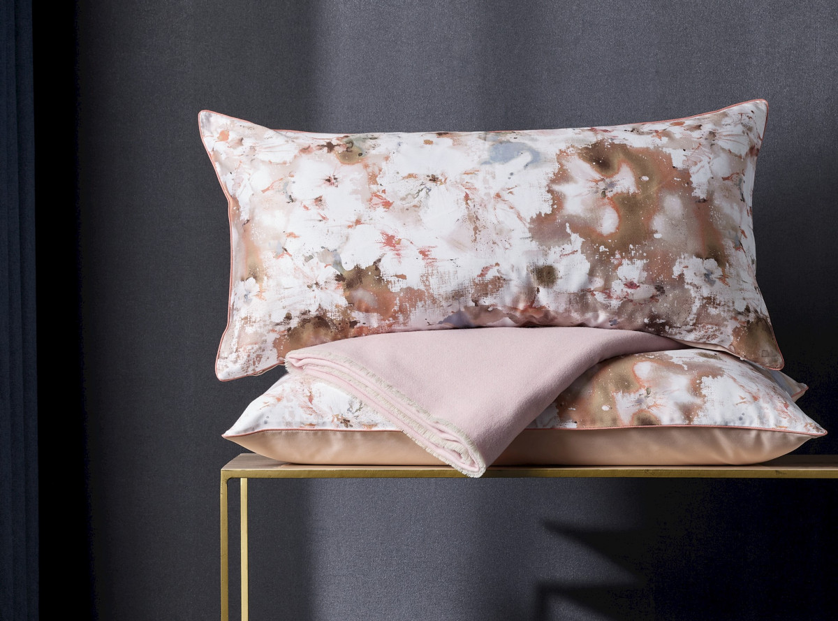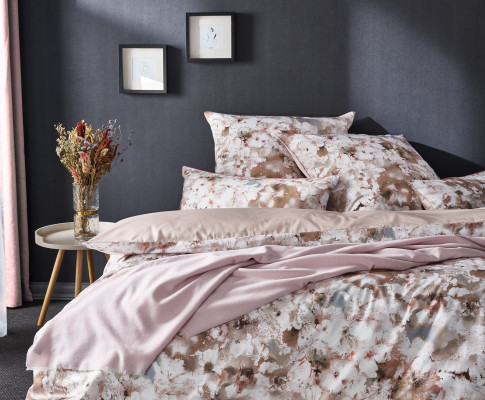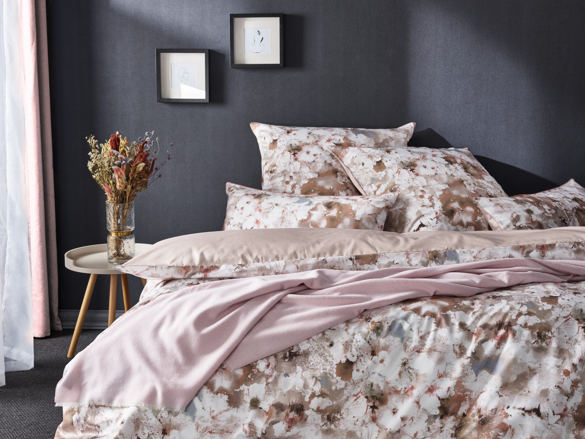 Die Bett- und Kissenbezüge im aquarellierten Blütenmotiv sind mit Uni-Rückseite und Qualitäts-Reißverschlüssen gefertigt, zudem sind alle Kissenhüllen mit 4-seitiger Paspel verziert.