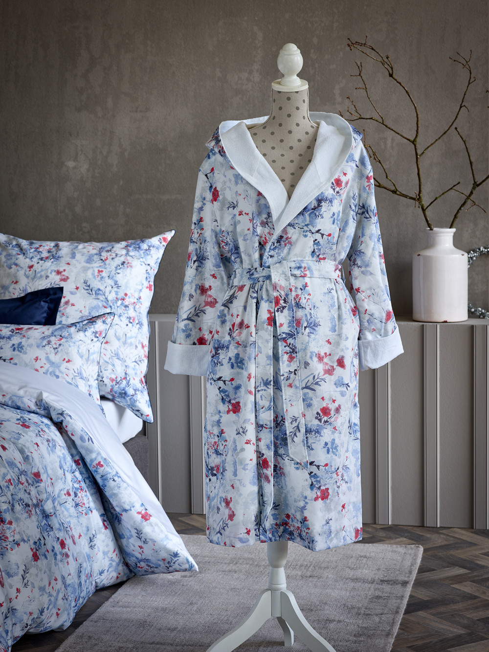 Den frottierten Damenmorgenmantel ziert die winterlich, gefrostet anmutende Musterung des Dessins 6218 ESTHER in der Farbstellung frosty blue.