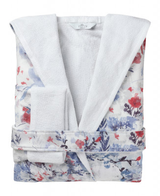 Abgerundet wird der Damenmorgenmantel, der mit eingearbeiteten Walkfrottier konfektioniert wird, durch eine Kapuze, Seitentaschen und Gürtel.