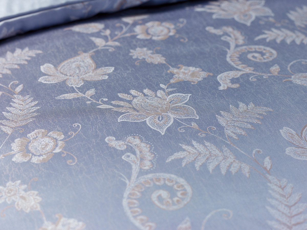 Stilisierte florale Elemente auf farbig strukturiertem Grund zeigt Dessin 9004 Elizabeth aus 100 % Baumwolle in hochwertigem Mako-Brokat-Damast.
