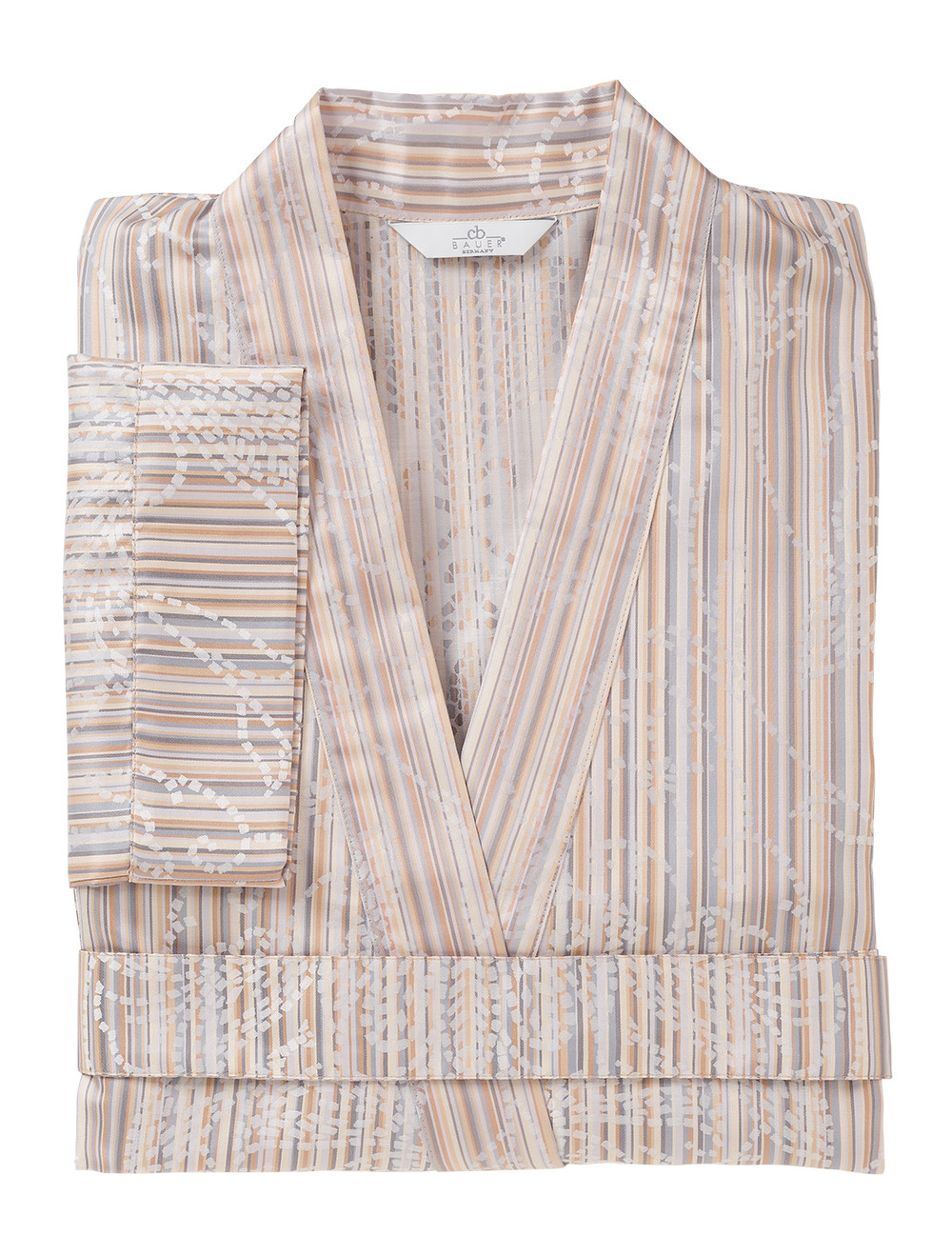 Der Damenmorgenmantel aus dem Mosaik-Muster-Dessin 9011 Kamika mit Gürtel und ¾ Ärmellänge der Marke Curt Bauer in hochwertigem Mako-Brokat-Damast aus 100 % Baumwolle ist buntgewebt, merzerisiert und bügelleicht.