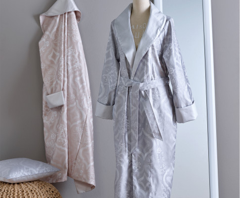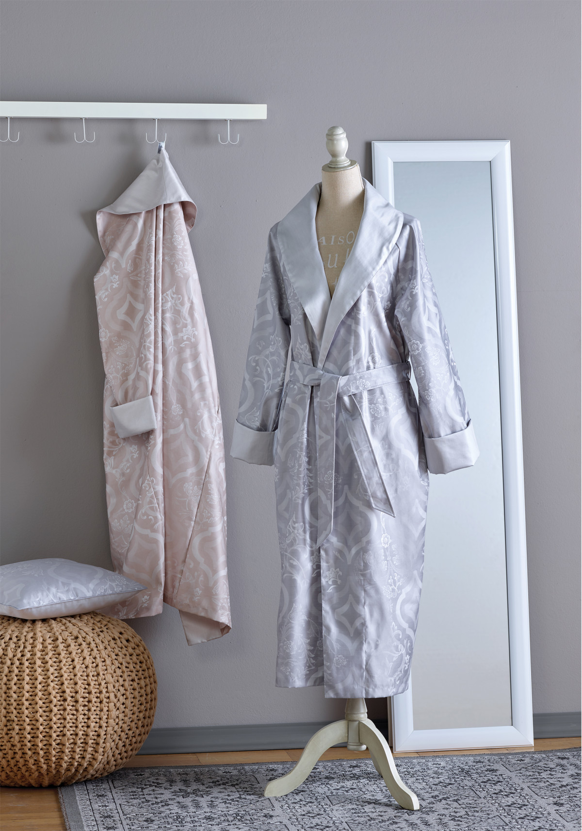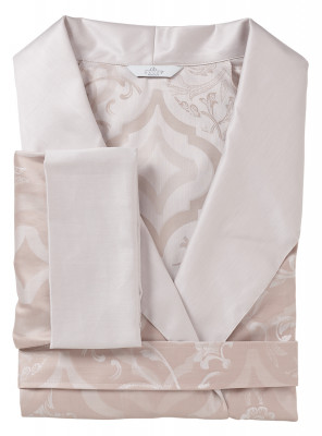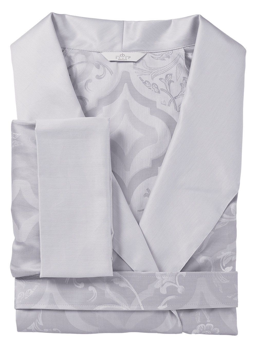 Schalkragenmorgenmantel aus Dessin 9014 Harriet aus 100 % Baumwolle, merzerisiert, bügelleicht und buntgewebt.