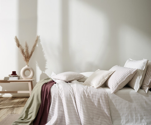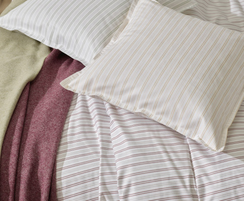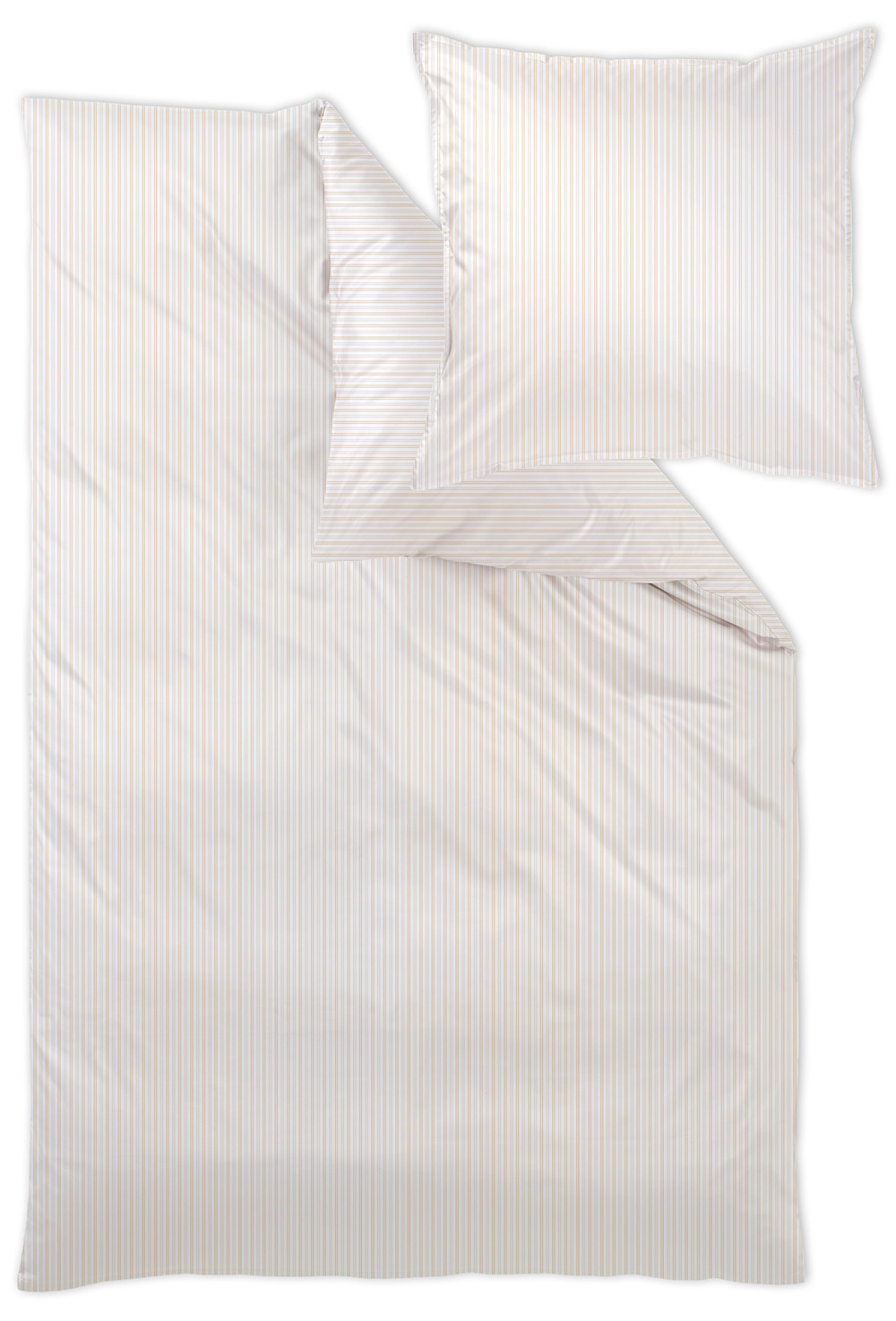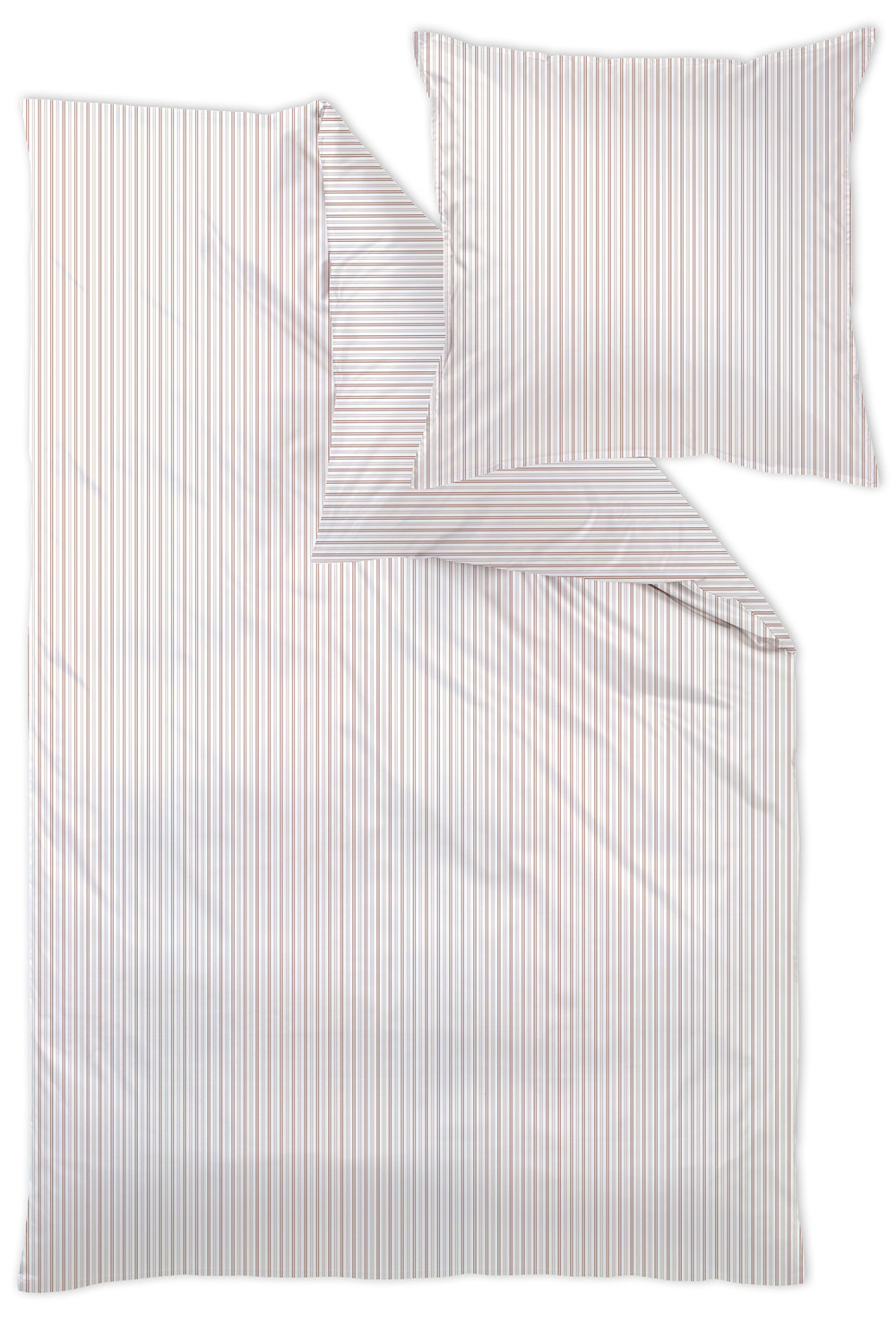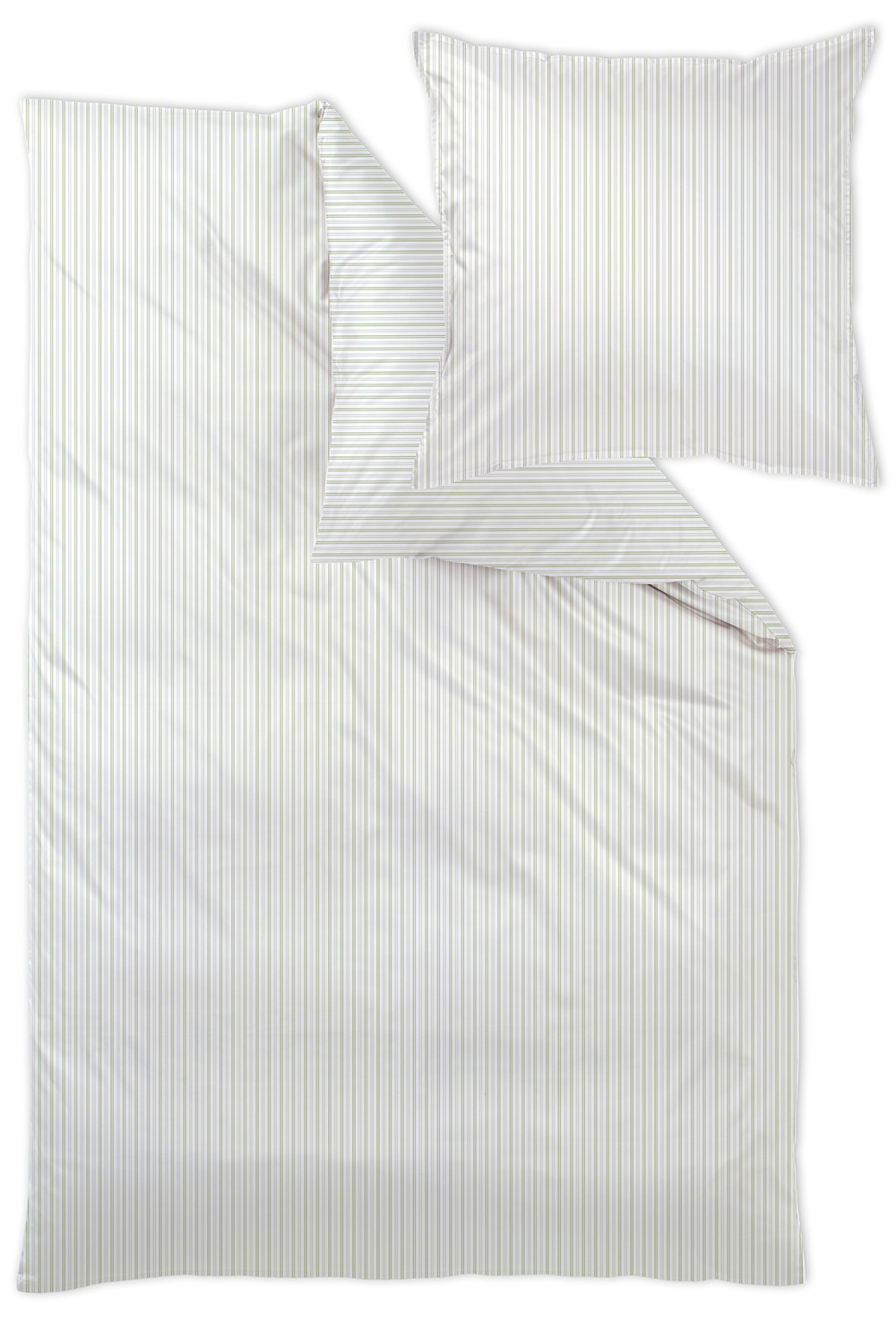 Der zweifarbige Wechsel der sich regelmäßige wiederholenden Doppellinien setzt sich zum feinen, wollweißen Fond der Bettwäsche ab.